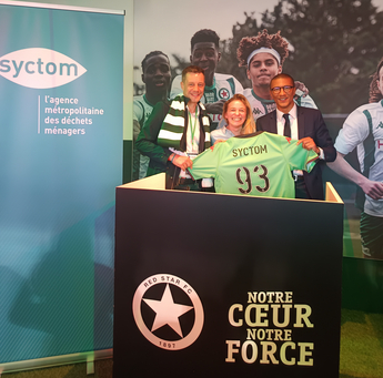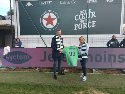 Lors du dernier match à domicile dédié à l'environnement le 3 mai dernier, en présence de Karim Bouarame, Maire de Saint-Ouen-sur-Seine, Pauline Gamerre et Louison Auger respectivement directrice générale et directeur général adjoint du club, ont accueilli Corentin Duprey, Président du Syctom afin d'officialiser le partenariat entre les deux entités. L’occasion aussi pour le Red Star FC de remettre au Président un maillot floqué, symbole de cette association fructueuse destinée à encourager le tri et la réduction des déchets !