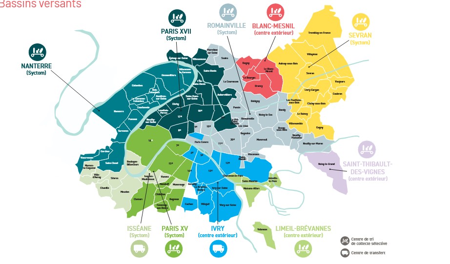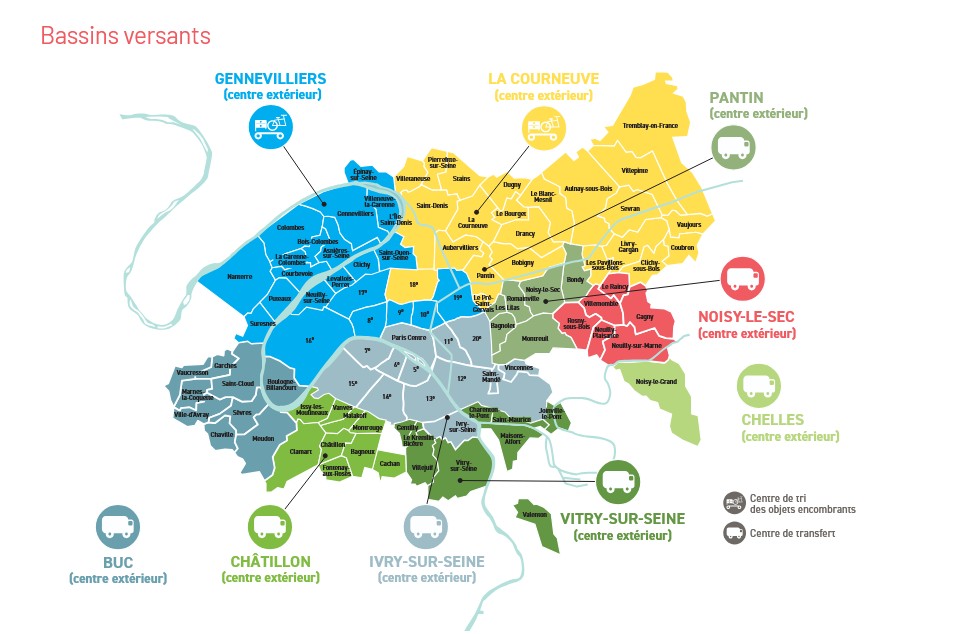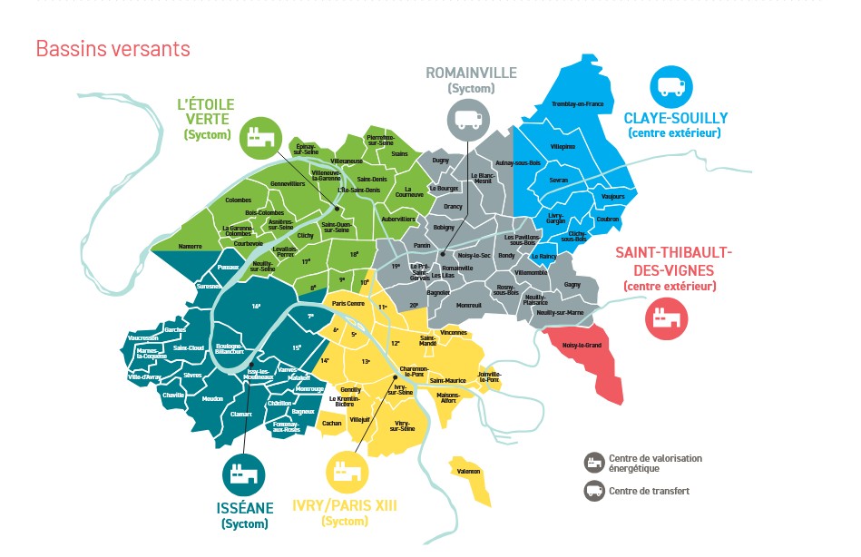Le territoire du Syctom s’organise en bassins versants, en fonction de trois modes de traitement : tri de la collecte sélective, tri des objets encombrants, incinération des ordures ménagères résiduelles. Dans une logique de proximité géographique pour limiter les transports, chaque bassin versant est associé à un centre de traitement, dans lequel les bennes de collecte des collectivités viennent déverser leurs déchets.